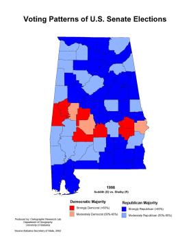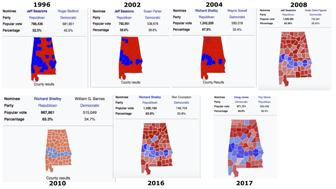 The exit-poll questions presented by the Washington Post pointed to Trump not being a particularly important factor in the race. Rather than it being necessarily the case that Donald Trump is the cause of such a great change (which somewhat coincides with the WP’s polls), I would make the argument that his presidency and Moore’s candidacy made people realize the urgency of the moment. Indeed, anecdotally of course, I saw a lot more activism, canvassing, and outward political support from Democrats than I’ve seen in a long time in this state. Such compounding factors can make people incredibly attuned to the political environment, and drive home the necessity of electoral action against a certain set of foes. Looking at the election maps below, for those counties that flipped in 2017, we can see a clear start in 2008 (perhaps even 2004 though shading wasn’t available in any of the maps I found) with Obama’s election. Those counties have been becoming more and more blue. Many of the counties we see flipping are also those which used to vote Democratic as late as 1996, and even official research into voting patterns show that many of these counties are only listed as moderately Republican in 1998: