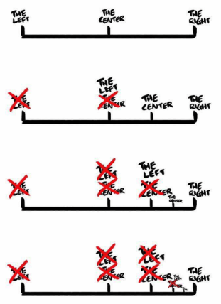 Even Paul Krugman, in his book The Conscience of a Liberal, decried the continuing shift to the right of liberal Democrats because they feel the need to compromise with conservatives. Appealing to moderation drags one’s politics to the right, as conservatives and reactionaries will always take but never give. The playing field thus continually shifts to the right, causing a realignment of what “moderate” even means: